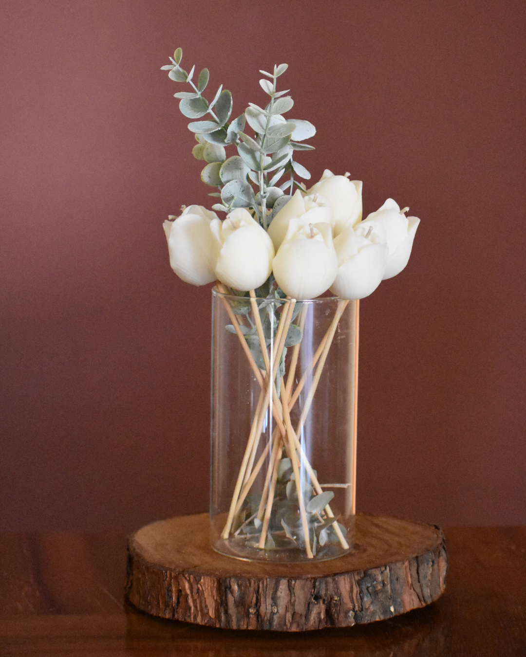 Florero de vidrio transparente con 11 velas en forma de tulipanes con follaje artificial